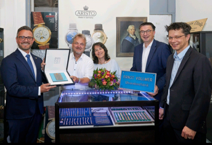 Bereits seit 100 Jahren fertigt das Unternehmen Metall-Uhrarmbänder und Bandgehäuse. Oberbürgermeister Peter Boch hat gemeinsam mit WSP-Direktor Oliver Reitz und Markus Epple, Geschäftsbereichsleiter der WSP-Wirtschaftsförderung, der Unternehmerfamilie für ihr langjähriges Engagement und die Treue zum Kompetenzstandort Pforzheim gedankt.